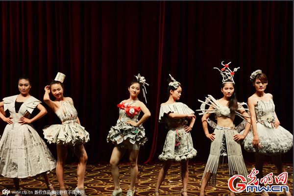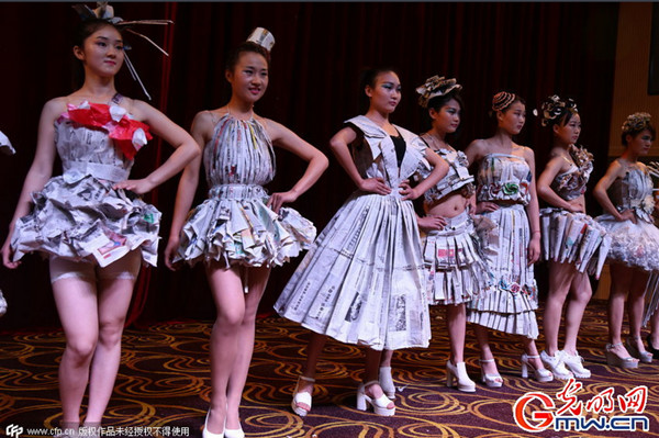 2015年05月14日,安徽省安庆市,安庆师范学院学前教育专业的学生上演创意手工服装秀,模特们身穿用废报纸和垃圾袋改造而成的晚礼服登台。
