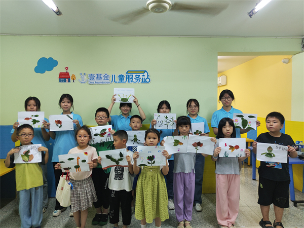 以树叶为基底,点缀以彩色绘画,孩子们同志愿者一同创作出了近20幅形态各异的特色树叶拼贴画,呈现出了金鱼、大熊猫、仙人掌等趣味形象。先挑选出适当的树叶,再白纸上勾勒拼贴雏形,最后将其拼贴整合,一朵栩栩如生的荷花便在朱景萱的手下“诞生”。朱景萱高兴地说:“我在‘荷花’两侧画了彩色花瓣,原来树叶也能够变成画的一部分,希望哥哥姐姐们还能教我们画画。”