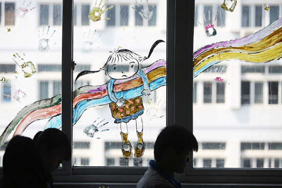 5月14日,安徽安庆。脸谱风筝、燕子纸鸢、撑伞的小女孩、戴红帽的小姑娘,这些不是传统作坊里的精美工艺品,也不是童话世界里的美丽幻想,在安庆师范学院文源楼412教室,2013级汉语国际教育二班的同学们给教室装扮出浓浓文艺气息。