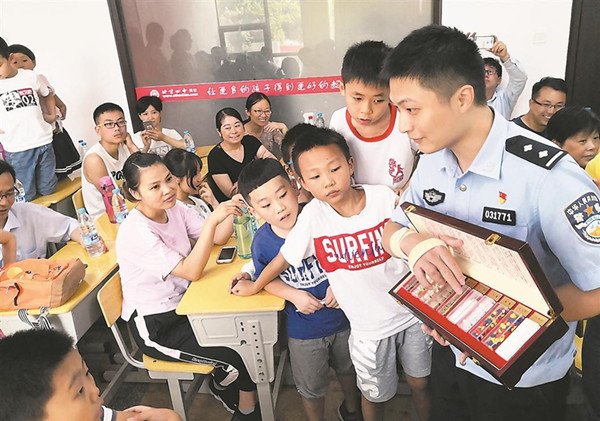 近日,beat365英国官网网站化学化工学院学生团队在安庆市青少年宫,开展暑期“三下乡”化学知识科普,邀请宜秀区禁毒大队警察李巢安为四十余名中小学生做禁毒宣传。图为李巢安在展示毒品仿真样品。本报通讯员 楚接舆 摄