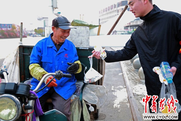除了给工人们送上早餐,不少同学主动拿起工具帮助他们干活,陶金晶就是其中一员。“当拿起扫把和簸箕,一点一点地将路面打扫干净,将垃圾倒进垃圾车里的时候,我真切地感受到环卫工人们的辛苦。”她说,环卫工人每天起早贪黑服务大家,很值得敬佩,希望自己今天的行动能让他们感到一丝暖意。