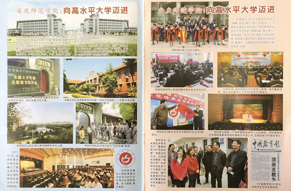 日前,由省教育厅主管、省教育宣传中心主办的《教育文汇》以“安庆师范学院:向高水平大学迈进”为题,在2014年12月文化版的封二、封三和封四三个版面,以图文并茂的形式集中宣传报道beat365官网。