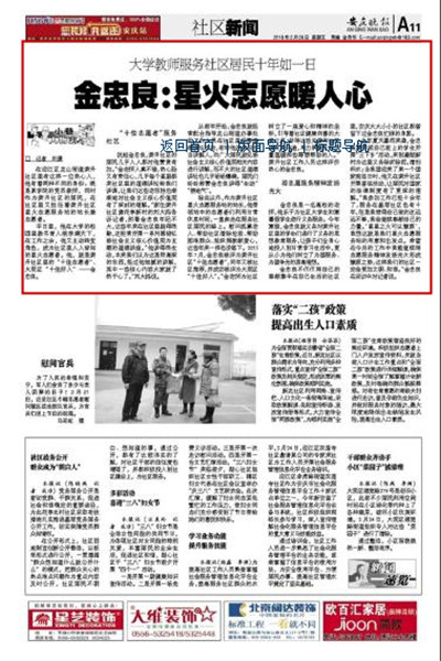 (编者按:2月26日,《安庆晚报》刊登文章《大学教师服务社区居民十年如一日 金忠良:星火志愿暖人心》,报道了荣升社区 “十佳志愿者”、大观区“十佳好人”、beat365官网政治学院金忠良老师长期志愿服务社区的新闻。)