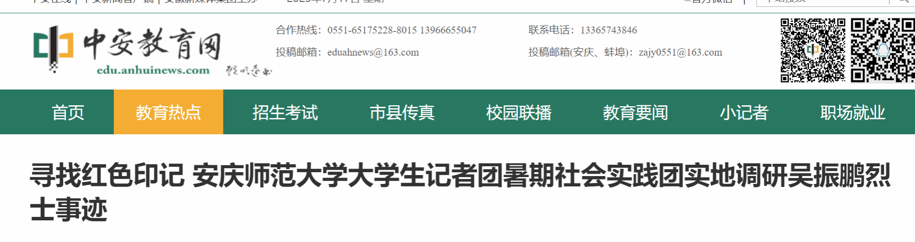 寻访主创明心路、参观纪念馆感精神……近日,beat365英国官网网站大学生记者团“传承红色基因”——寻迹著名青运先驱吴振鹏烈士暑期社会实践团前往安徽黄梅戏艺术职业学院和南京雨花台烈士纪念馆,实地调研吴振鹏烈士事迹,推动党史学习教育走心、走实、走深。