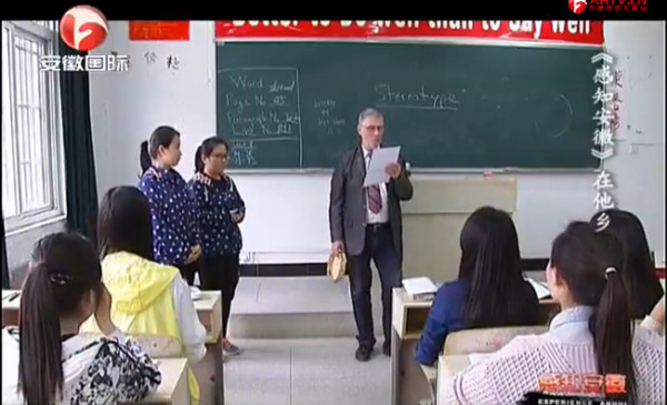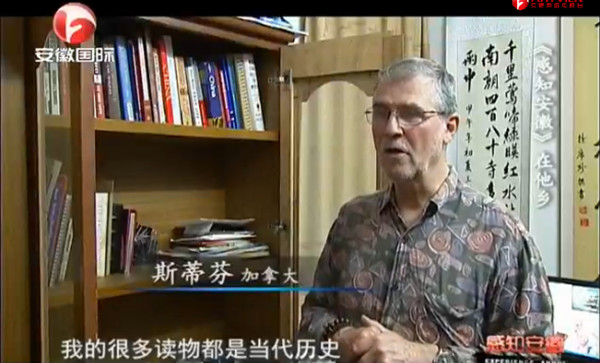 5月13日中午,安徽广播电视台国际频道“感知安徽”栏目播出beat365官网加拿大籍外教史蒂芬专题记录片《在他乡》,时长12分30秒。《在他乡》细致地呈现出史蒂芬老师在安庆师范学院工作、生活的场景,在画里画外流露出离别时特有的珍惜与欣慰之情。