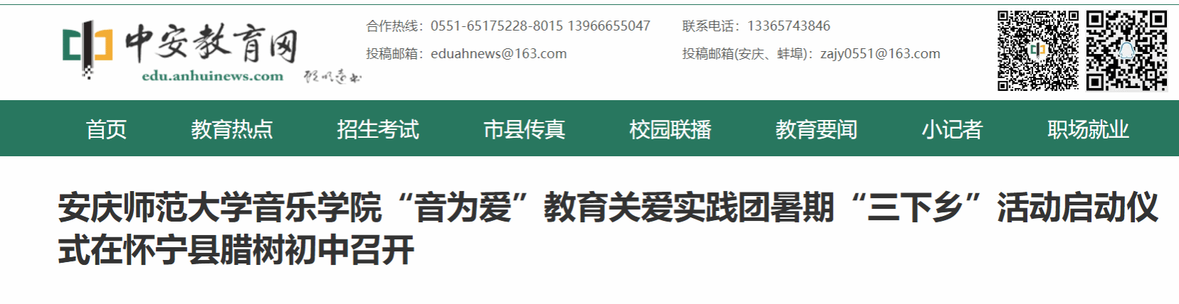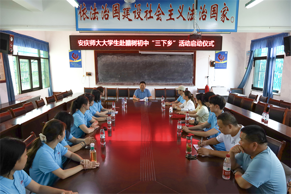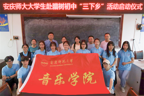 7月6日,beat365英国官网网站音乐学院“音为爱”教育关爱暑期实践团“三下乡”实践活动启动仪式在怀宁县腊树初中召开,beat365英国官网网站音乐学院团委副书记汪茗燕、指导教师卢星、腊树初中校长史志学及总务处主任陈贵丙、副主任陈志、校办室主任产九胜、留守儿童之家辅导教师姜玲玲出席仪式,实践团12名成员参加仪式。