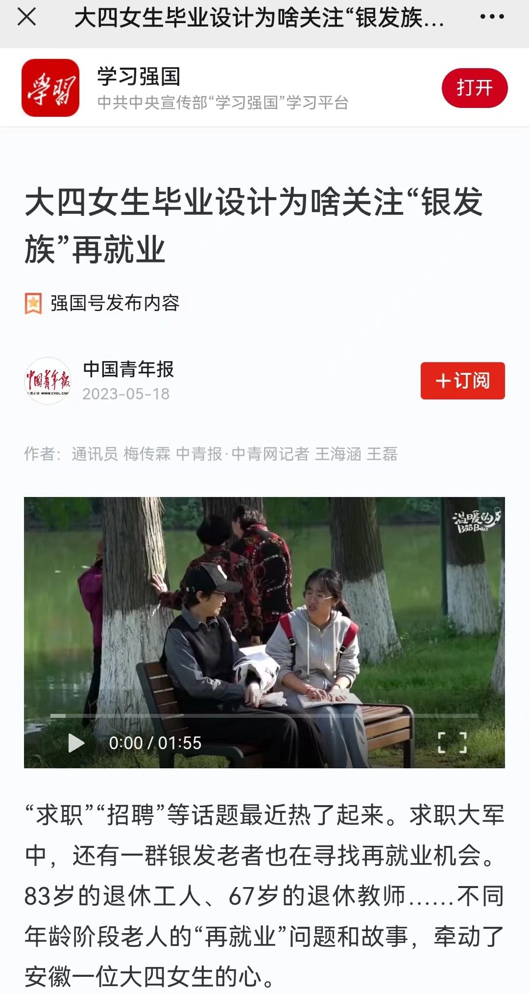 “求职”“招聘”等话题最近热了起来。求职大军中,还有一群银发老者也在寻找再就业机会。83岁的退休工人、67岁的退休教师……不同年龄阶段老人的“再就业”问题和故事,牵动了安徽一位大四女生的心。
