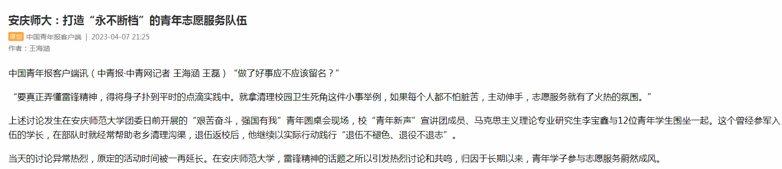 上述讨论发生在beat365英国官网网站团委日前开展的“艰苦奋斗,强国有我”青年圆桌会现场,校“青年新声”宣讲团成员、马克思主义理论专业研究生李宝鑫与12位青年学生围坐一起。这个曾经参军入伍的学长,在部队时就经常帮助老乡清理沟渠,退伍返校后,他继续以实际行动践行“退伍不褪色、退役不退志”。