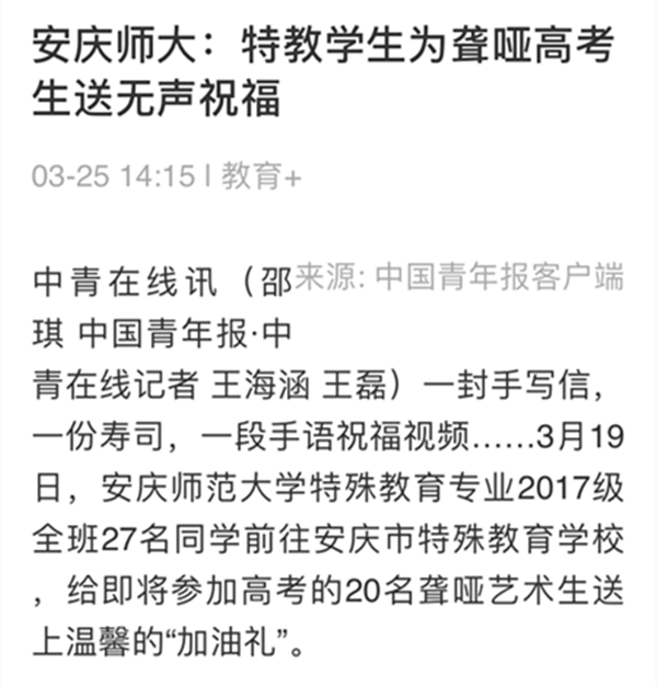 中青在线讯(邵琪 中国青年报·中青在线记者 王海涵 王磊)一封手写信,一份寿司,一段手语祝福视频……3月19日,beat365英国官网网站特殊教育专业2017级全班27名同学前往安庆市特殊教育学校,给即将参加高考的20名聋哑艺术生送上温馨的“加油礼”。