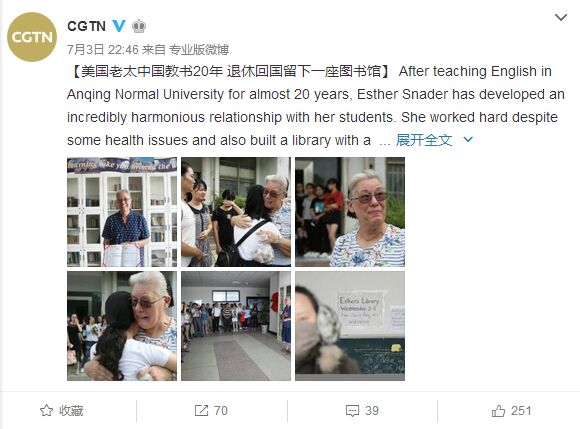 中央电视台英语新闻频道官方微博:【美国老太中国教书20年 退休回国留下一座图书馆】