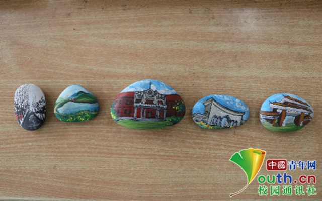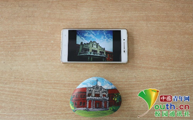 即将面临大四毕业的她,为了纪念自己的大学时光,自学石头画,将学校的建筑画在石头上。中国青年网通讯员 于康生摄