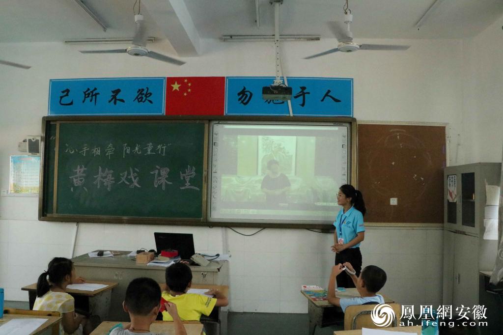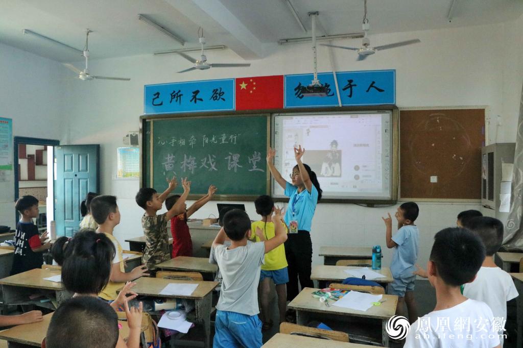“小朋友们,咱们安庆最有名的是什么?”“黄梅戏。”“心手相牵 阳光童行”团队成员范俊楠正在教室里带孩子们感受黄梅戏的魅力。为了让孩子们深入了解黄梅戏,范俊楠给孩子们讲述了安庆黄梅戏的起源和发展历史,随后引出要学习的黄梅戏经典曲目《女驸马》。