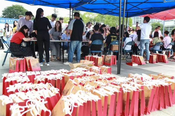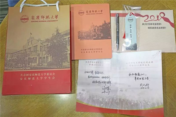 早上7点,就有不少毕业生来到活动现场。他们排起长队,凭使用了4年的校园卡领取这份学校精心准备的礼物。汉语言文学专业2015(2)班的桂牛洪表示,“领到这么多精致的礼物,特别是校领导为我们手写寄语和期望,让我很感动,学校送的礼物很有纪念意义。”