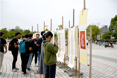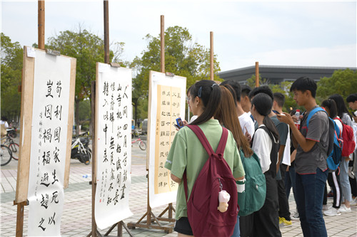 快闪结束后,“献礼新中国70华诞作品展”在广场上展出。现场展出的陶艺、剪纸、书法等不同种类的五十余件作品,均来自安庆师大各艺术俱乐部学生的手工制作。中国地图的剪纸作品、赞美祖国河山的书法作品、形态各异的陶艺作品……引得不少学生驻足观看。