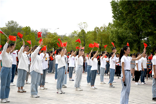 网络与新媒体专业2019(2)班的桂仁雯挤在人群中拿着手机录视频。“这是我第一次参与快闪,看到那么多人还是挺震撼的。能够为祖国献歌,我感到十分自豪。”她说,“我为新中国70周年华诞献的贺礼就是要认真完成学业,未来可以用自己所学为祖国的发展贡献一份力量。”