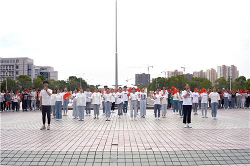 中午放学铃声一响,手持五星红旗,整装待发的快闪小队迅速各就各位,摆好队形。吉他手弹唱《今天是你的生日》将原本要放学离开的学生吸引到广场上来。伴奏响起,合唱团齐声演唱歌曲,嘹亮的歌声在广场上空萦绕不绝。围观的学生越来越多,并都自发地领取了五星红旗,跟着合唱团一起挥舞歌唱。广场上逐渐形成了近千人的红色方阵,共同唱响对祖国的赞歌。