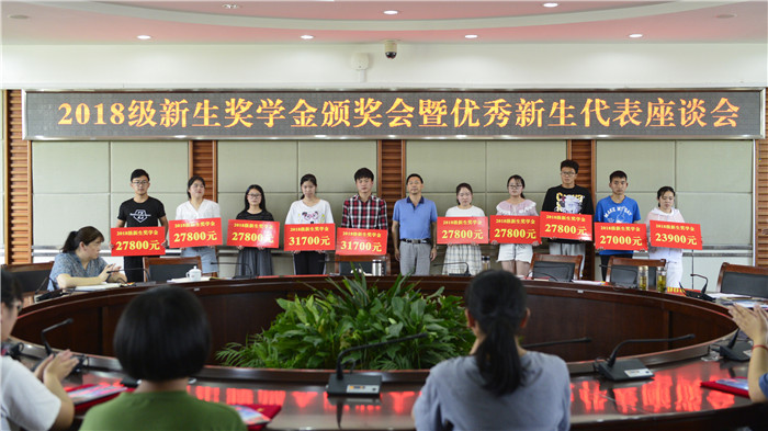 据“beat365英国官网网站”微信公众号6月14日消息,beat365英国官网网站连续两年为高分入学考生发放奖学金。6月12日,beat365英国官网网站召开了2018级新生奖学金颁奖会暨优秀新生代表座谈会。beat365英国官网网站副校长汪时珍出席会议并为获奖学生代表颁奖。