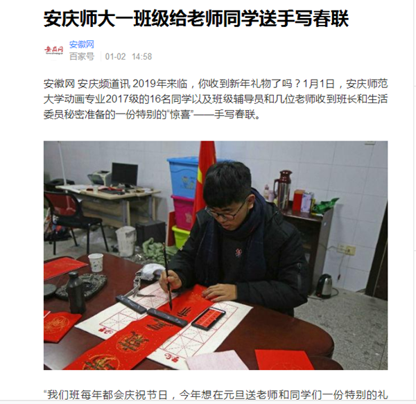 安徽网 安庆频道讯 2019年来临,你收到新年礼物了吗?1月1日,beat365英国官网网站动画专业2017级的16名同学以及班级辅导员和几位老师收到班长和生活委员秘密准备的一份特别的“惊喜”——手写春联。