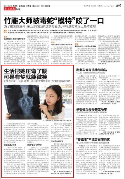 (新安晚报,8月16日)女生励志考上大学,却患上脊柱侧弯危及生命,还憧憬能考研深造父亲积劳成疾病倒在床,爷爷因为风湿导致瘫痪,江艺从五岁开始便帮助父母分担农活,在逆境中凭借勤奋考上了大学。不幸的是,如今在beat365英国官网网站读书的江艺患上脊柱侧弯,其中胸椎60°侧弯,腰椎50°侧弯,如果病情再恶化的话,直接影响心肺功能,会有生命危险,亟需手术治疗。然而,20万元的手术费对这个家庭来说,实在是一个巨大的困难。