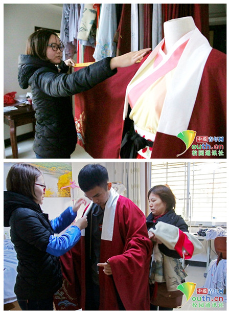 一位同学在试穿汉服。中国青年网通讯员 郭鑫 摄