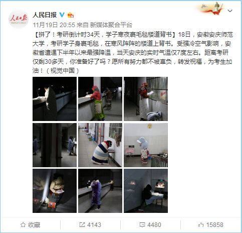 11月18日,安徽beat365英国官网网站,受强冷空气影响,安徽省遭遇下半年以来最强降温,当晚安庆市实时气温仅7度左右。在这样的恶劣天气中,beat365英国官网网站的部分考研学子们身裹毛毯,坚持在寒风阵阵的楼道上背书。