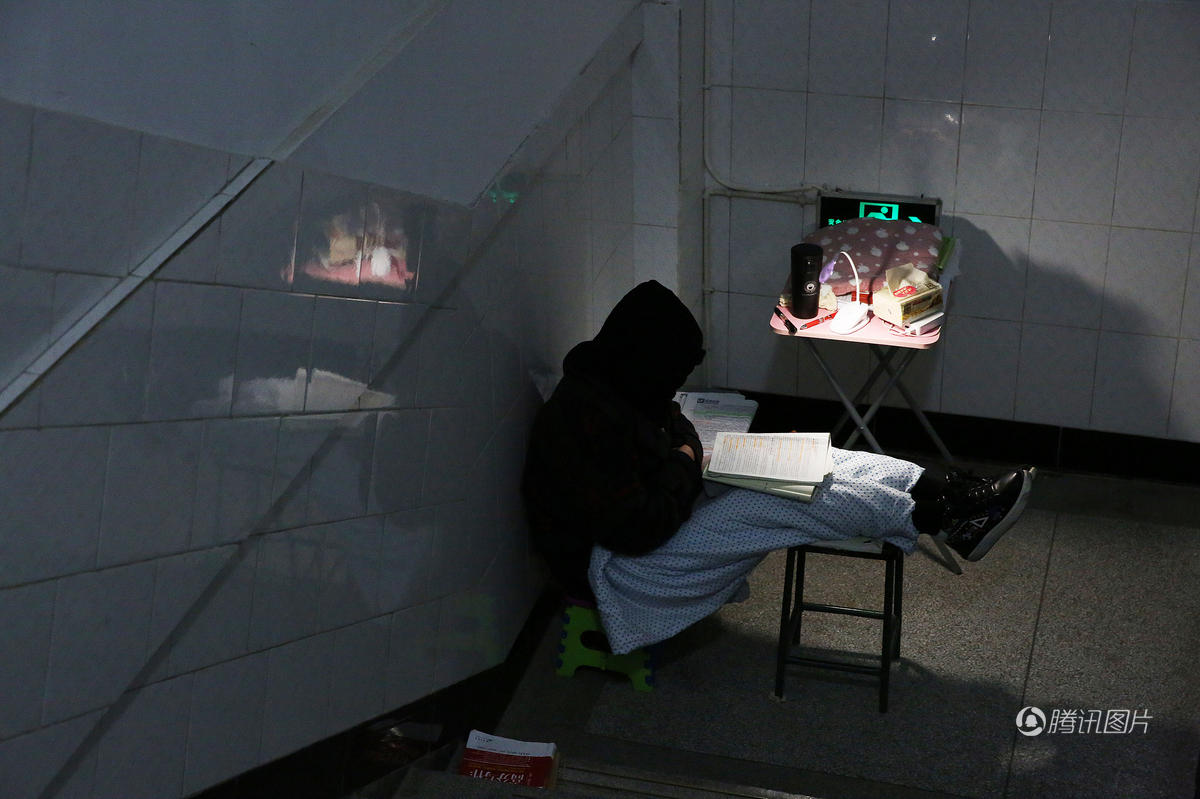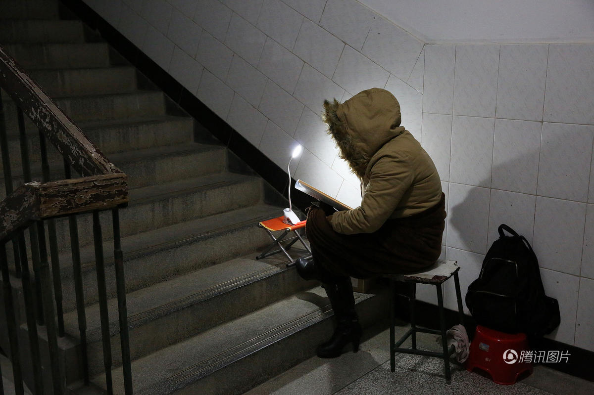 考研学子在楼道内全副武装,挑灯夜读。