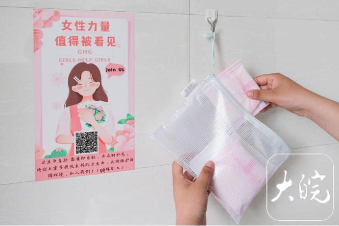 张君在每个自助点都放上7片卫生巾,并在旁张贴海报,提醒取用卫生巾的女生及时补充。为避免细菌滋生和卫生巾受潮,她采用密封文件袋包装卫生巾。由于个人力量有限,张君还特意建立聊天群,期待着更多伙伴的加入。