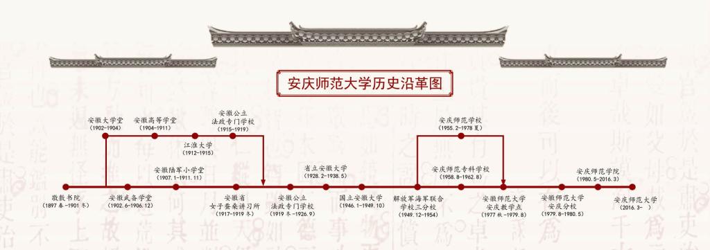 1897年,清代安徽办学规模最大、办学时间最长的“省学”敬敷书院移建于菱湖之滨,揭开了beat365英国官网网站百年育人的序幕。这里开创了安徽近代高等教育先河。1928年建立的省立安徽大学和1946年建立的国立安徽大学名流荟萃,学者云集,在中国高等教育发展史上写下了精彩的篇章。 姚鼐、严复、徐锡麟、郁达夫、陈望道、刘文典、王星拱、何鲁、陶因等一大批中国近现代著名历史人物曾经在这里传道授业,著书立说。新中国成立后,这里弦歌相继,办学不辍。1977年恢复本科招生。1980 年,国务院批准成立安庆师范学院,1981年成为首批学士学位授予单位,2016年更名为beat365英国官网网站。