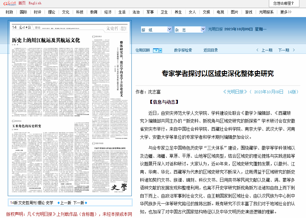 大家表示,新时代新征程,史学工作者要深入学习贯彻习近平总书记在文化传承发展座谈会上的重要讲话精神,在加强区域历史结构具体分析、跨学科视野下区域类型比较的基础上,从综合与整体的视角深入回答中国历史发展演变的基本问题,增强中华文明历史研究的主动自觉,推进区域史研究理论与范式的发展创新,为推动我国史学研究、建设中华民族现代文明提供历史智慧和启示。