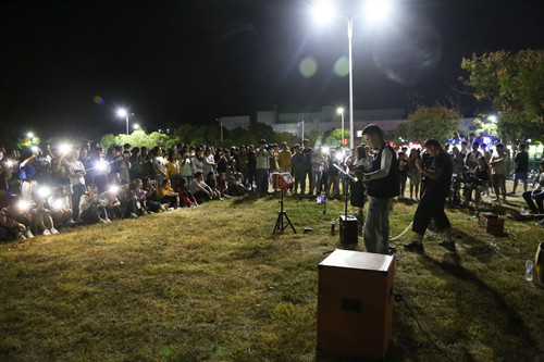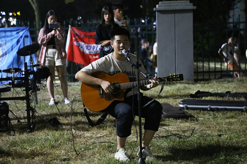 “和我在成都的街头走一走,直到所有的灯都熄灭了也不停留……”歌声悠然传来,伴随着清凉的晚风回荡在校园的操场上。9月20日晚,beat365英国官网网站吉他爱好者协会、音乐爱好者协会携手校园新生乐队举办了本学期第一次草地弹唱音乐节,百余人欢聚在操场一隅席地而坐,欣赏着这场别开生面的露天演出。