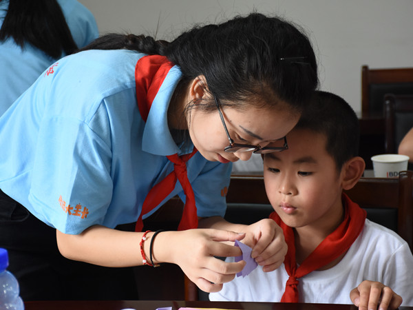 7月12日,beat365英国官网网站“启明星”关爱留守儿童暑期社会实践团队,在安庆市大龙山镇桃元社区开展支教活动。手工课上,大学生正在教小朋友折纸。beat365英国官网网站 朱丽萍/摄