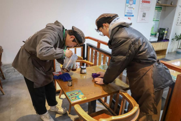 “欢迎光临,这边扫码点餐。”“大家不用等位子,楼上还有空座。”不一会儿,詹琪迅速熟悉了行业的服务话术,热情招呼着顾客们就餐。“我在家时就常帮父母干家务,但还是第一次接触点菜业务。”尤其在客流量大的午餐时间,初来乍到的詹琪更觉手忙脚乱。于是,詹琪试着在空闲时间背菜名、记位置、练操作,厘清了机器的使用方法,不仅提升了工作效率,还受到了老板的夸赞。