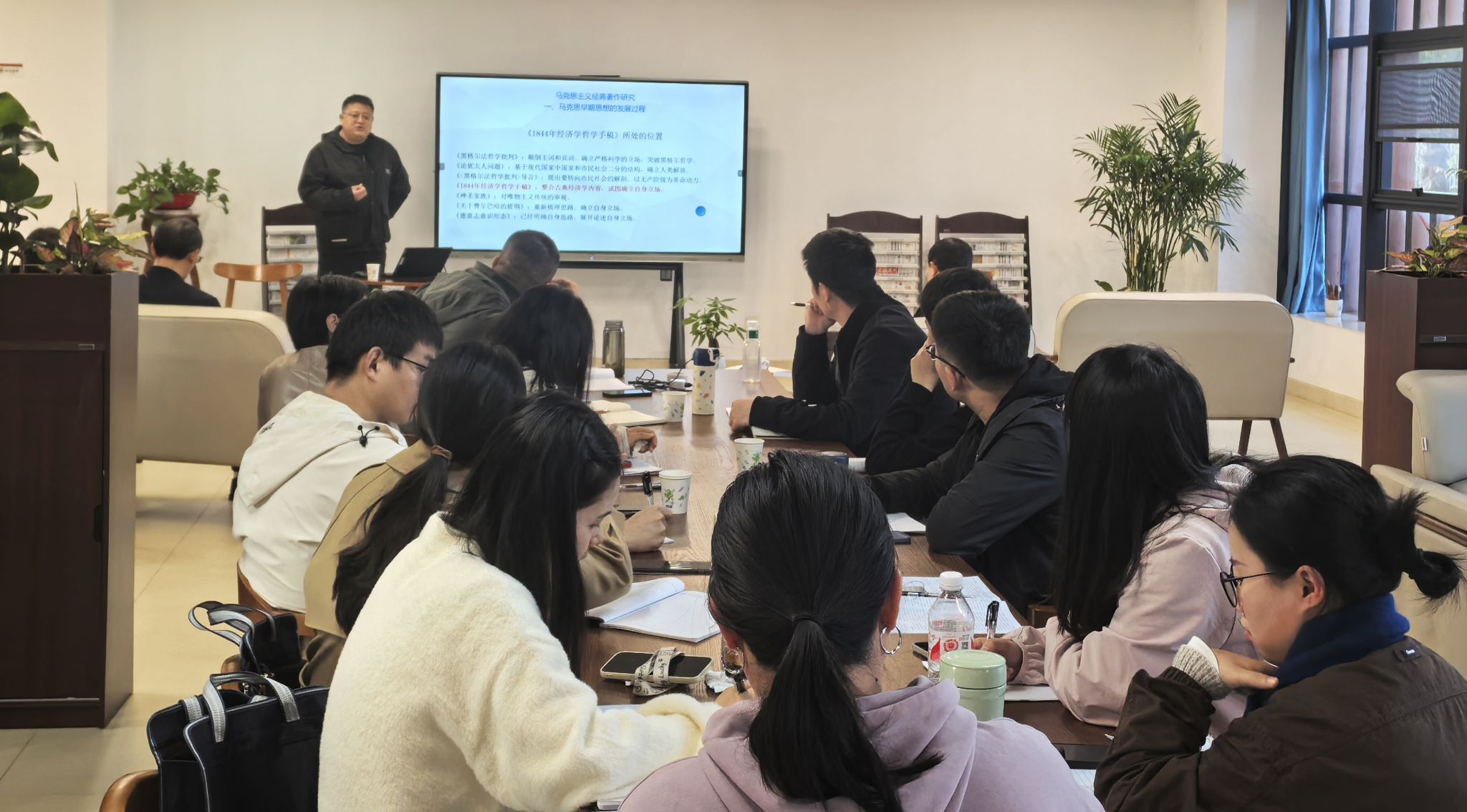 此次读书会由两部分内容组成。一是理论学习。马克思主义学院副教授、硕士生导师黄海东围绕习近平总书记考察安徽重要讲话精神,从习近平总书记2024年安徽之行、习近平总书记考察安徽重要讲话精神的内涵要义和学习贯彻习近平总书记考察安徽重要讲话精神等方面进行了宣讲。二是原著导读。马克思主义学院青年博士刘倬帆围绕《1844年经济学哲学手稿》,从马克思早期思想的发展过程、《1844年经济学哲学手稿》的特点和阅读要点、笔记本Ⅲ中的异化和异化意识批判等方面进行了深入浅出的讲解。