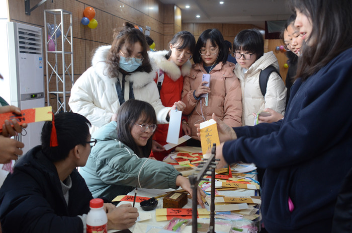 “逢考必过”“来日可期”“狂吃不胖”……整个展区中最热闹的要数邓石如书法班展区,展台前摆放着各式书写着定制祝福的书签。古色古香的样式与流行祝福语的结合颇受学生们欢迎,前来欣赏书法作品、排队选购书签的学生络绎不绝。应用心理学专业2020(1)班的邓民涛定制了一枚写着“中考加油”字样的书签,他说:“想把这份特别的礼物送即将中考的弟弟,希望能够激励他努力学习。”