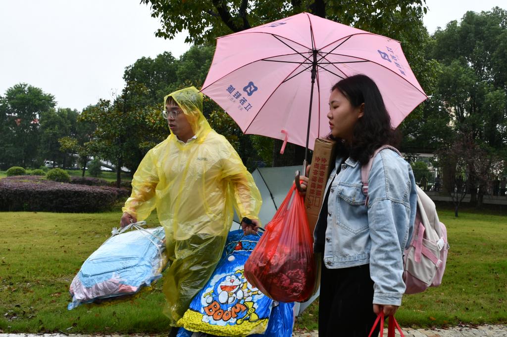 “男生嘛,淋点雨没关系的,既然做了就要担起这份责任,不能耽误迎新的整体进程和大家的时间”,环境工程专业2019(1)班的奚昌盛已经冒雨迎接了7位新生,身上的衣服湿了干,干了又湿。