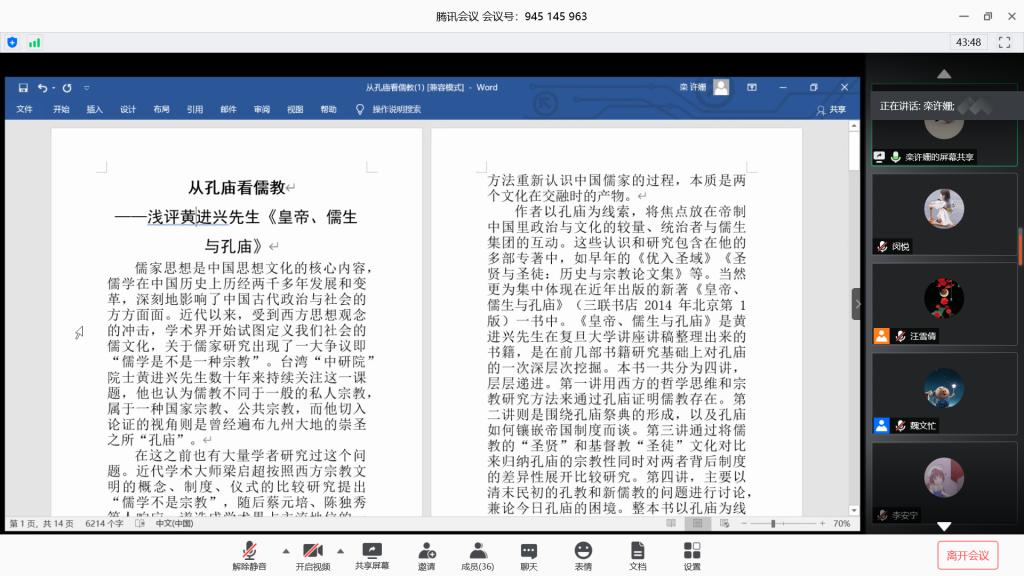 本次读书沙龙采取评议制,社团成员发表自己对所读书籍的看法、讲述个人心得体会,再由其他同学进行点评。历史学专业2019(2)班的常轩东说:“每个人对文章的解析都是不同的,通过互评的方式,大家既能畅所欲言地表达自己的想法,还能通过思维碰撞,产生更多的感悟,共同提高阅读能力和文化素养。”