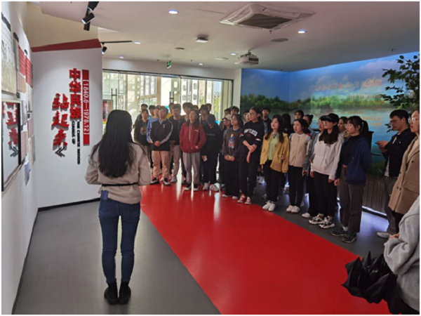 进入宜秀党建馆,同学们跟随讲解员的步伐,了解馆内的各项设施及其呈现的历史。战争模拟演示厅内,声光影的现代手段让同学们身临其境。视觉上的感受和讲解员的解说结合,使同学们感受到中国共产党史、新中国史、改革开放史和社会主义发展史在时间长河中纵合,新中国的面貌日新月异,新中国的发展奔腾不息。