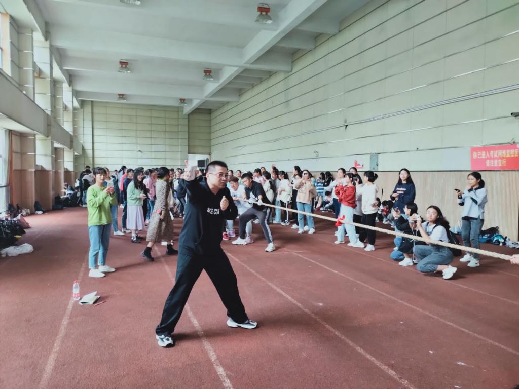 此次比赛采用小组循环赛的形式,以班级为单位,各班队员分别比赛,并分为男子组、女子组、男女混合组三大系列。各队队员相互角逐切磋,场上比赛队员气势如虹,何骏书记和新生辅导员黄兴请老师也加入到新生拔河比赛的队伍中,场下啦啦队队员们的呐喊声、加油声响彻整个体育馆。各队员之间配合默契,何骏书记作为裁判员更是判断精准,赛场上气氛活跃,充分显示了同学们的团结精神和踊跃参与比赛的激情。