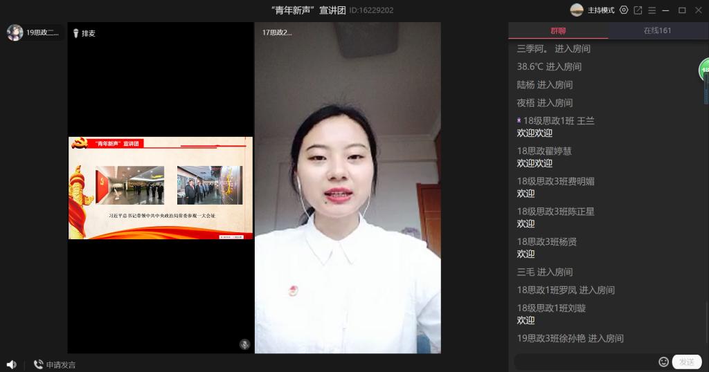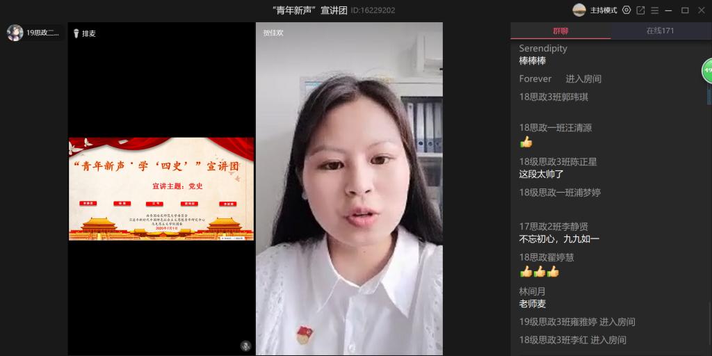 为深入贯彻落实习近平总书记关于加强党史、新中国史学习教育的重要论述,庆祝中国共产党成立九十九周年,7月1日,beat365官网“青年新声˙学‘四史’”宣讲团围绕中国共产党成立的背景及党的一大,开启“云端”第一讲。宣讲活动由马克思主义学院本科生党支部书记主持,马克思主义学院党员、研究生、本科生收看了本次宣讲活动。