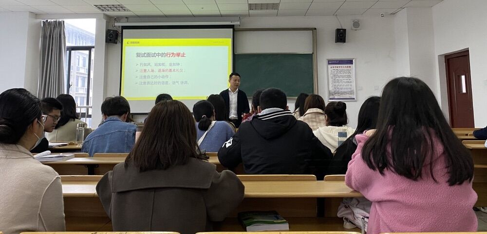 刘彬有着丰富的考研复试指导经验,多年来,指导了众多考研学子成功通过考研复试。刘彬向同学们介绍了考研复试的方方面面的细节:从个人简历的制作、与导师的交流细节,到面试的重要性、面试的流程,都进行了详细指导。在讲到面试技巧方面,他还亲自做了示范,让聆听讲座的同学们能更直观地感受到面试细节的重要性。