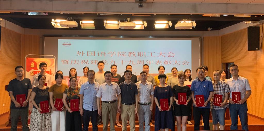 为庆祝中国共产党成立99周年,深入学习贯彻习近平新时代中国特色社会主义思想,不断激发广大党员干部爱党爱国和干事创业的热情,7月1日,外国语学院党委举行庆祝建党99周年系列活动暨“七一”表彰大会。学院党政领导及全体教师党员、教职工参加会议,大会由学院党委副书记夏斐主持。