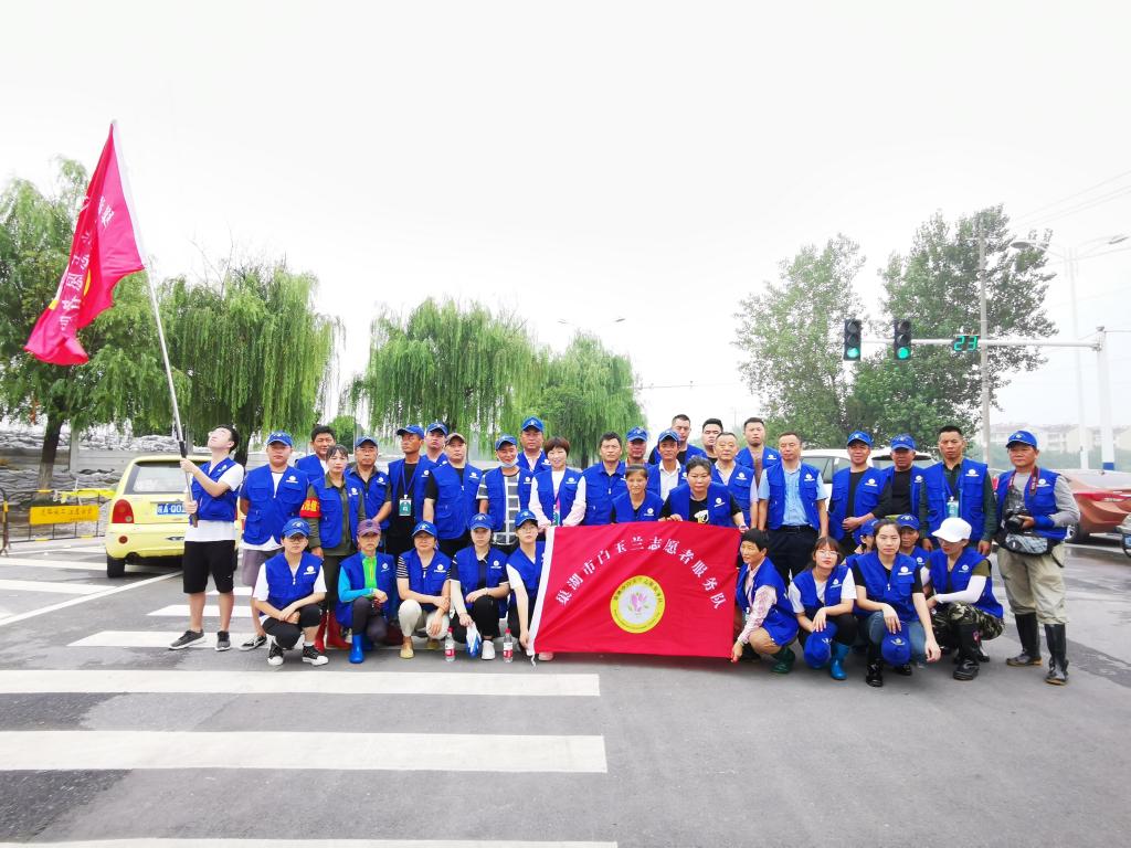 图为孙梦卓(第一排右一)加入巢湖市白玉兰志愿者服务队抗洪救灾时的图片
