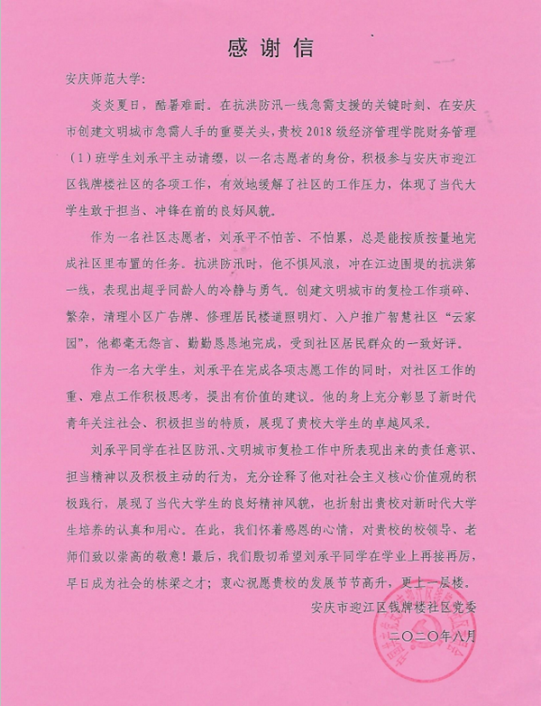 义务值守在抗洪防汛工作一线,协助清理街道违章广告牌、修理维护小区楼道照明灯、入户推广智慧社区“云家园”……财务管理专业2018级学生刘承平同学细数着暑期一个多月以来志愿服务在在安庆市迎江区钱牌楼社区的经历,收获满满的感叹道,“暑假既当过长江抗洪防汛工作志愿者,又参加了社区文明创建工作,这是我人生中一次难忘的青春经历,这个假期过得真充实”。