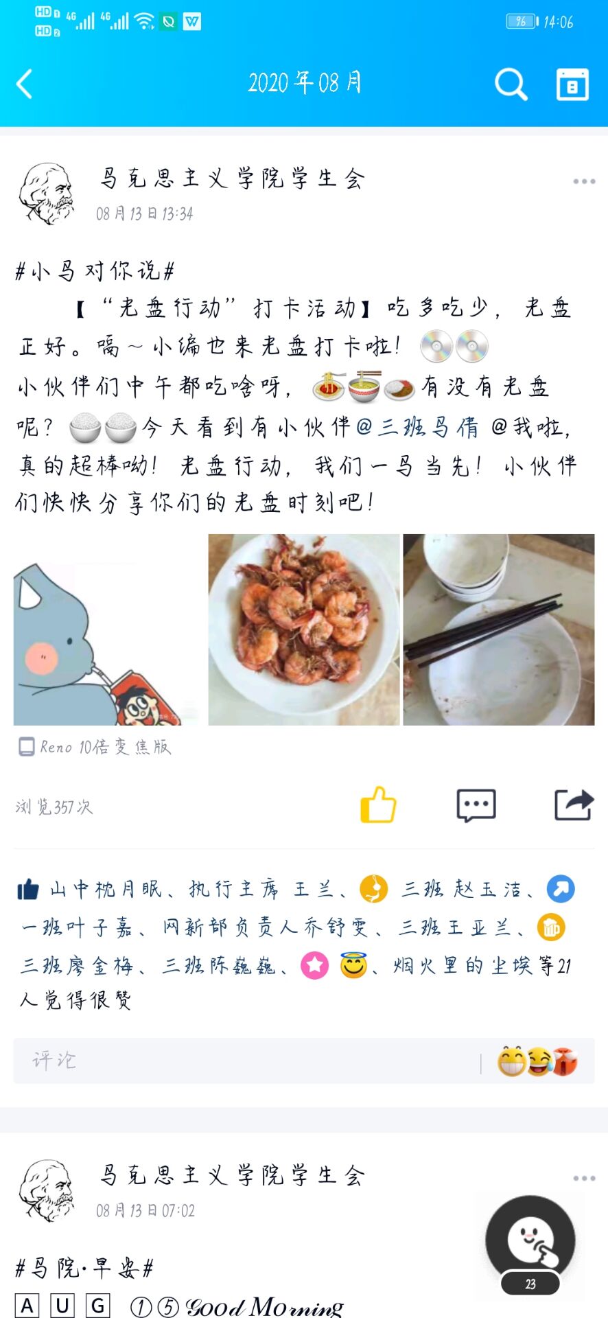 为了让更多的学生了解“光盘行动”、支持“光盘行动”和参与“光盘行动”,积极响应总书记制止餐饮浪费行为的重要指示精神,学院团委组织开展线上推文学习和打卡活动。学院倡导同学们认真学习《人民日报》上刊登的《习近平:坚决制止餐饮浪费行为》内容,同时鼓励大家就“光盘行动”、“餐饮浪费”等内容进行交流探讨。同学们积极参与其中,思想政治教育专业2019级3班侯骏逸在参与讨论时说,我们应该将光盘行动常态化,光盘行动,文明就餐应当成为每个人的日常习惯。“近年来,餐饮浪费的现象层出不穷。制止餐饮浪费,培养节约习惯,是每一个公民应当肩负的责任。作为青年大学生,我们更应该从自身做起,勤俭节约,艰苦奋斗”,则是思想政治教育专业2019级1班黄雨格针对当今“餐饮浪费”的现象提出的观点。