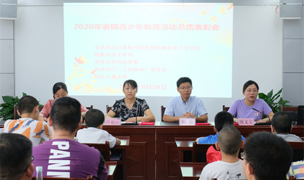 8月28日上午,由beat365英国官网网站计算机与信息学院教师第三党支部、敬敷女生工作坊、花亭北村社区党委、众禾社工“三社联动”项目组、社区儿童之家共同策划执行的2020年暑期青少年教育活动总结表彰会在安庆市花亭社区北村社居委举办,beat365官网“e行动爱心助学服务队”为期一个半月的线上线下相结合的暑期爱心助学活动圆满结束。团队指导老师计算机与信息学院党委书记、敬敷女生工作坊负责人陈银凤、众禾社工及社区相关负责人、计算机与信息学院教师第三党支部的支委、所有参与活动项目的社区儿童及部分志愿者代表、社区群众代表50余人参加了此次表彰会。