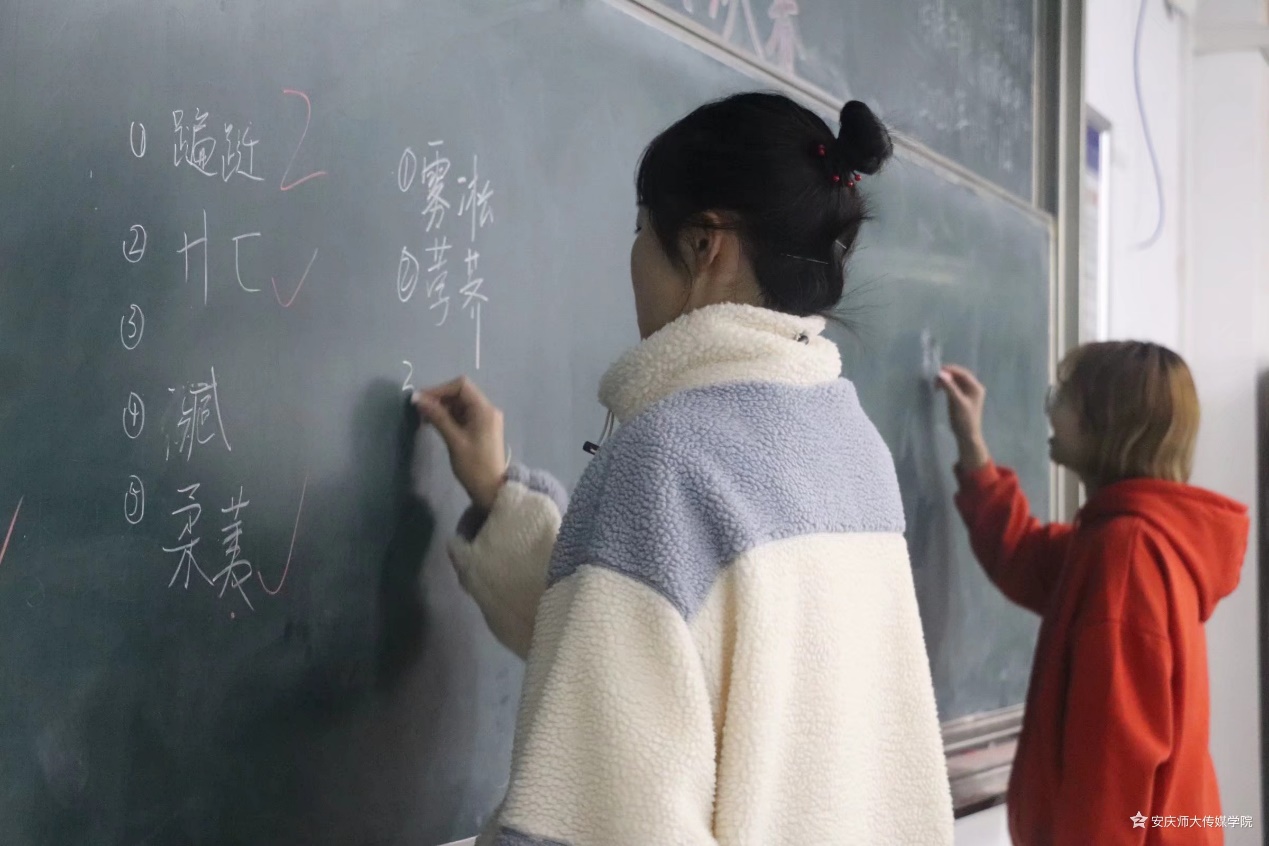 查找读音、记忆生僻字、互相听写……比赛开始前一小时就已经有同学到达考场复习考试内容,经过初赛筛选,四支队伍进入决赛。“应会应知,轮番上阵”环节各队按预先决定的顺序上讲台听写,由裁判核对正误,选手在20秒内作答。“争分夺秒,现场记忆”环节需现场快速记忆,选手们相互鼓励,为派出队员加油。