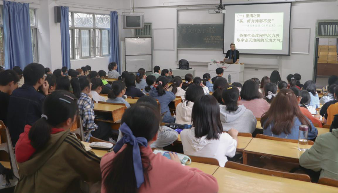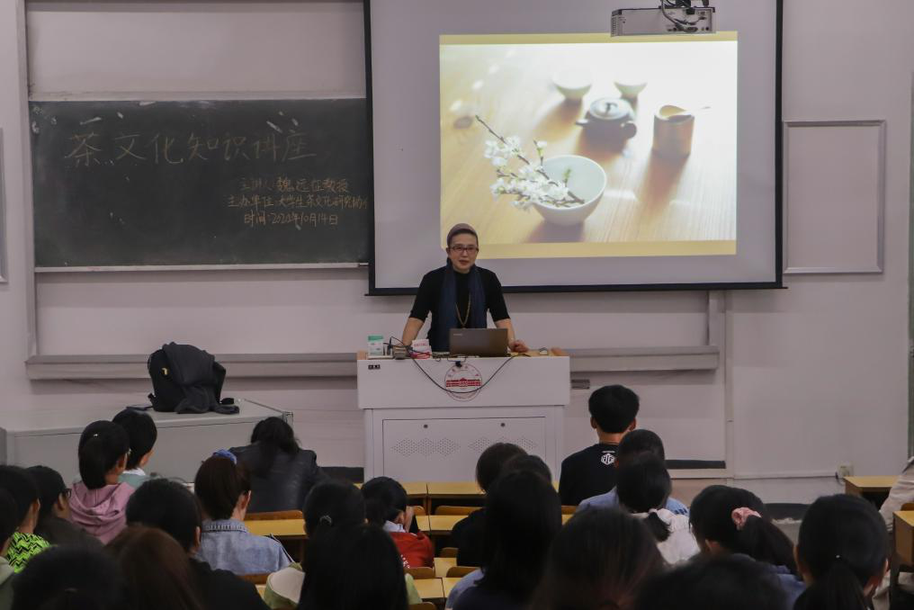 10月14日,大学生茶文化研究社在beat365官网菱湖校区举办了茶文化知识讲座。此次讲座由人文学院魏远征教授主讲,人文学院100余名学生共同聆听了此次讲座。