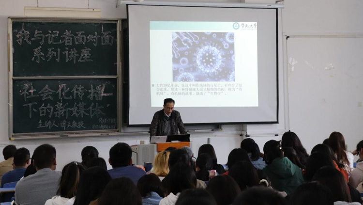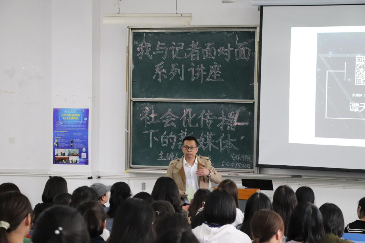 10月23日,传媒学院开展“我与记者面对面”主题讲座,学院第七届记者文化节正式拉开序幕。暨南大学谭天教授应邀为学生开展以“社会化传播下的新媒体”为题的讲座,学院部分教师以及三百余名学生参加了此次讲座。