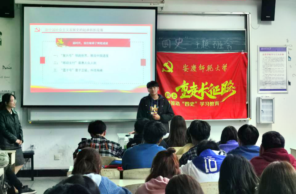 活动开始时,首先由辅导员卢星致辞,希望通过此次主题活动,同学们能够进一步了解四史,了解国家的过去、现在与将来。会中,各班团支书围绕着英雄、复兴、创新、信念四个重点主题的深化学习四史,同时与“四个自信”相结合,向大家阐述了自己对于四史的认识。英雄是人民的脊梁,复兴是人民觉醒的力量,创新是民族不竭的动力,信念是民族心中永屹的长城。2020级音乐学(4)班团支书荣波涛以自身经历为例,发出由衷的感慨:“我爷爷告诉我,如果在过去几十年,回家是需要花费半天甚至一天的时间,如今只需几十分钟,我真切的感受到了科技的力量,这,就是中国速度!”