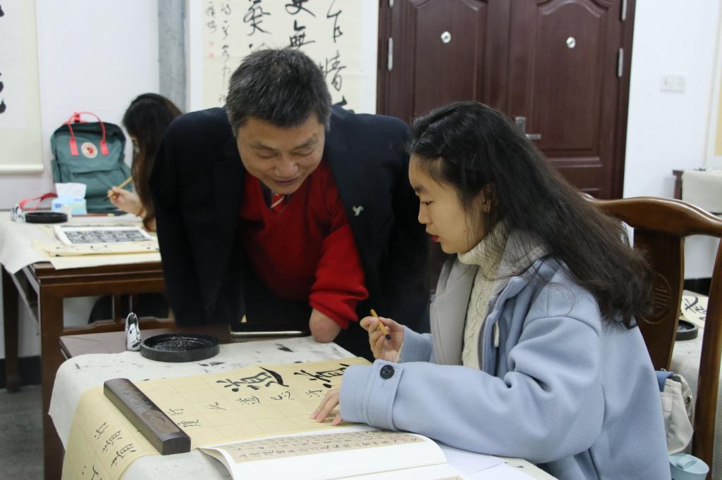 “邓石如不仅是书法家,还是篆刻家、文字学家、画家。他在书法艺术上有很高的造诣。”赵靖为书法班学员们讲解了书法学习相关知识,并对学员的书法作品进行了了一对一指导。